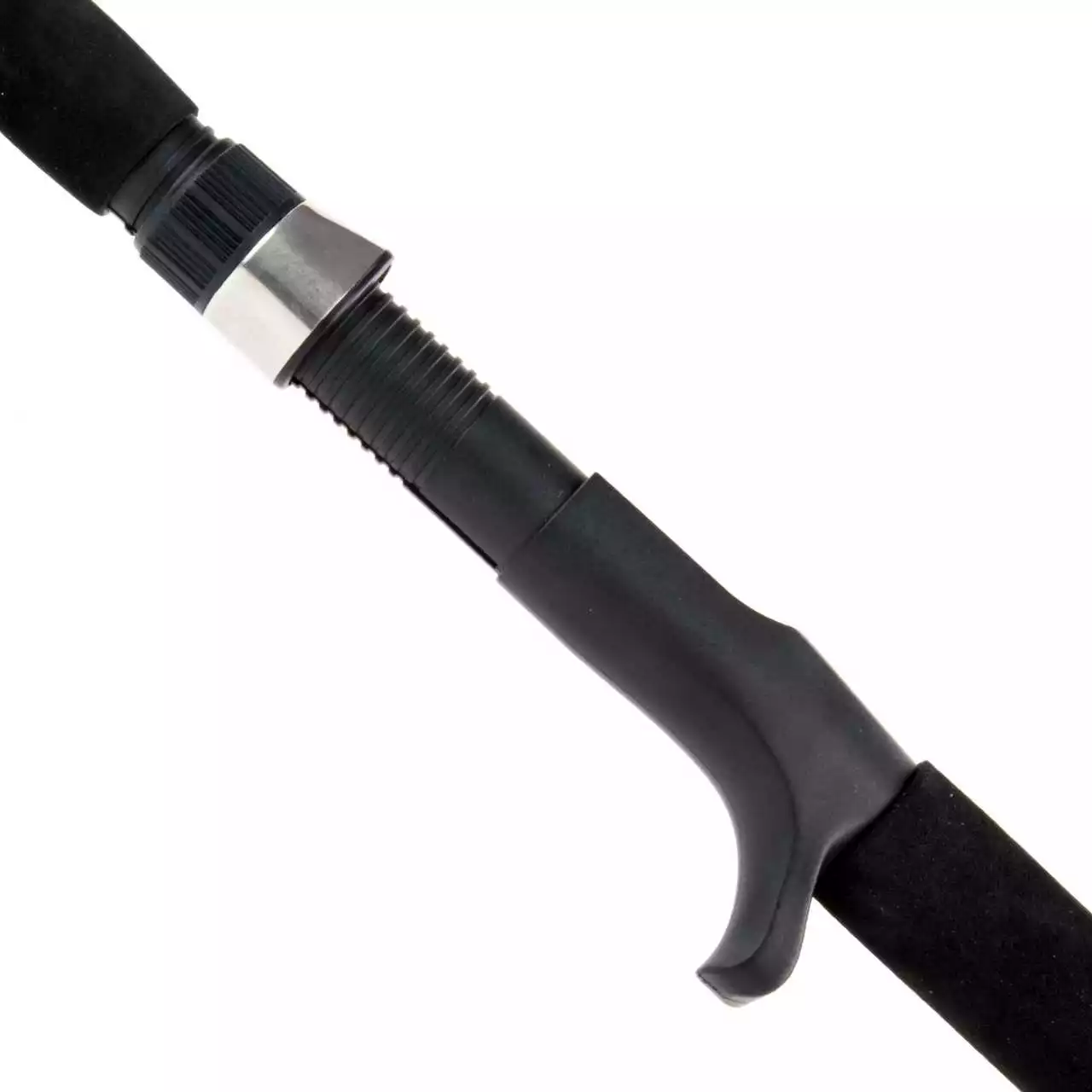 Nur das Handteil ist eine herkömmliche hohle und steife Kohlefaser- konstruktion, da hier Verformung nicht mehr erwünscht ist. Durch den Trigger Baitcast- und Multi-Rollenhalter ermöglichen die WFT Sen Sea Salzwasserruten einen einfachen „Einhandbetrieb“, so dass eine Hand immer an deiner Multirolle bleiben kann.